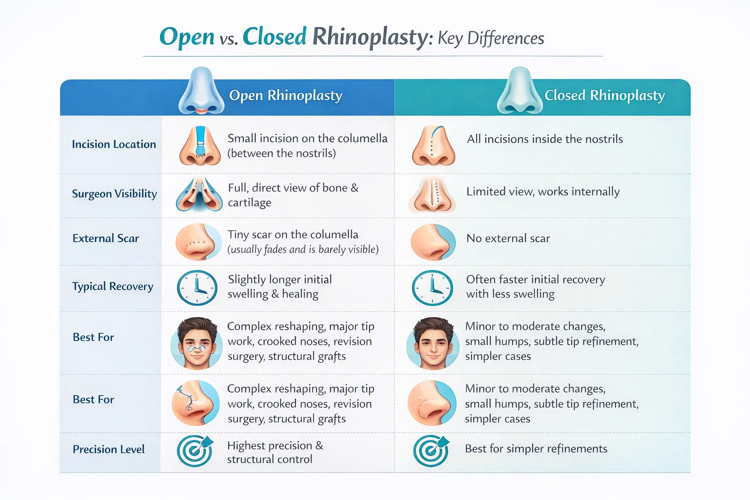 Infographic suggestion: Consider including a side-by-side Open vs. Closed Rhinoplasty comparison chart showing differences in incision location, visibility, scar, typical recovery, and ideal use cases for each technique.